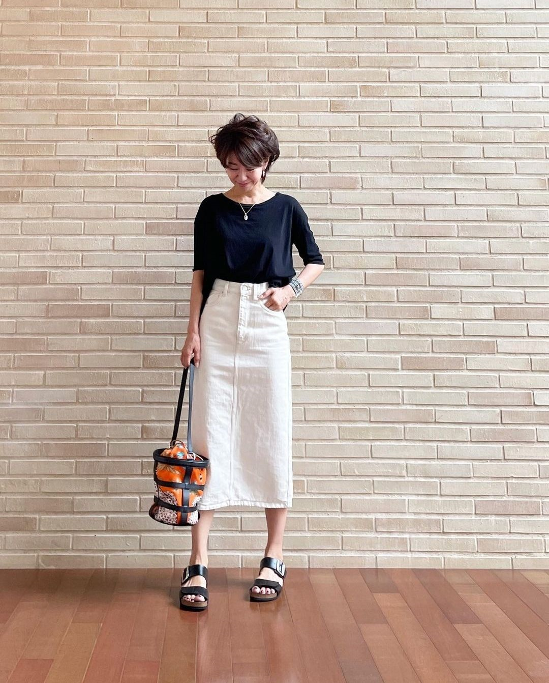 三七分的搭配是当下越来越受欢迎的,像这身黑色短款套头衫,配上白色高腰牛仔直筒裙的造型,这种显高又显瘦的搭配之下,显现出了这位女士三七分的身材比例,配上一款厚底凉鞋之后,增高又拉长腿长。