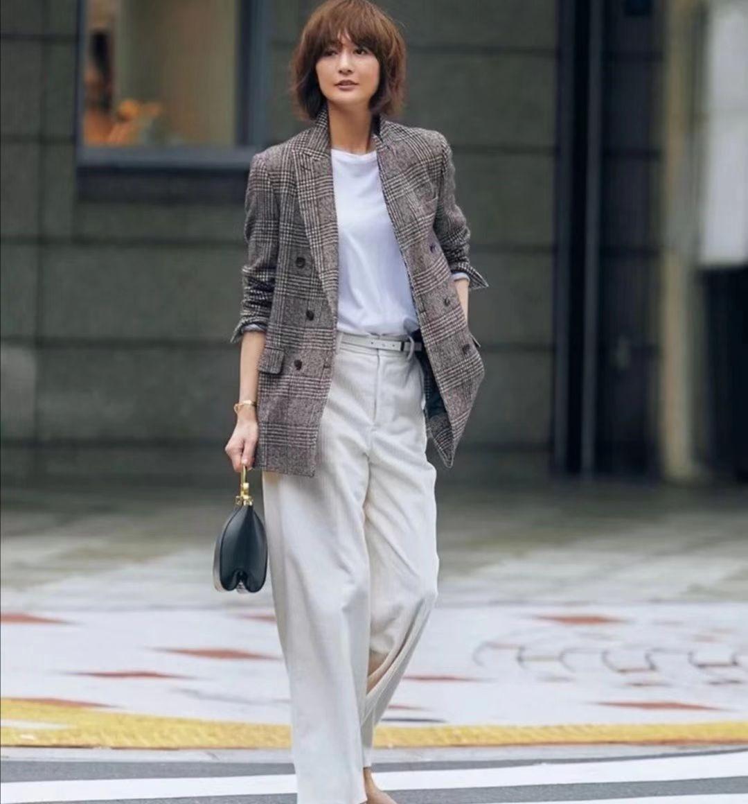 格纹西服作为当下大火的复古单品之一,越来越多女性喜欢尝试格纹元素的西服,来彰显自身的时髦感,这身略显低调的格纹西服配上白色高腰阔腿裤的造型,干练大方,中年女性驾驭起来也特别的显年轻。