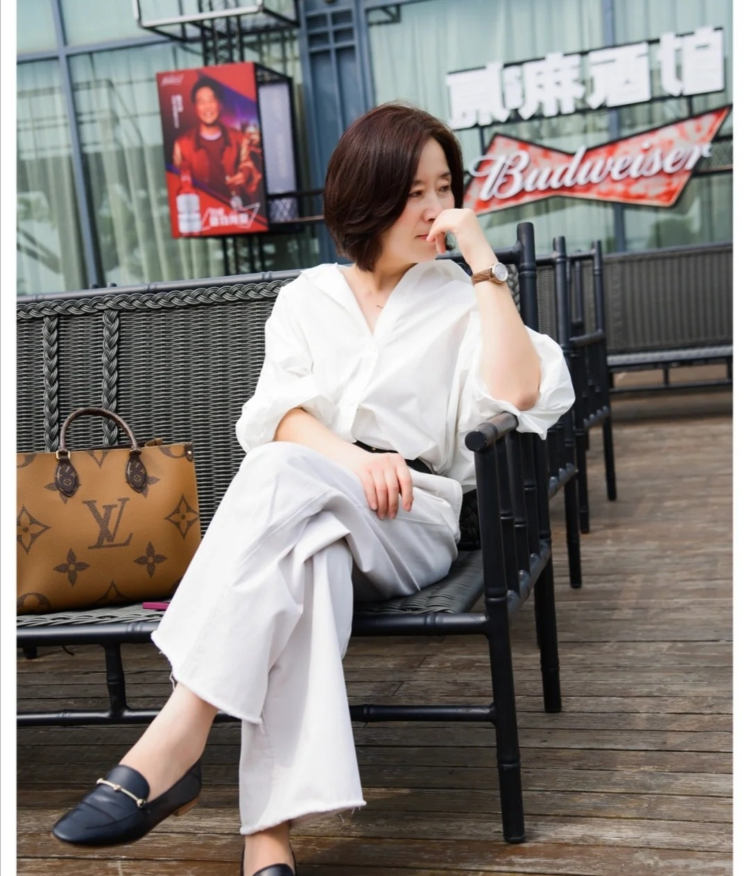 宽松的白色衬衫配上白色高腰阔腿裤,既能够很好的遮肉显瘦,同时宽松单品搭配在一起又保持了较好的风度。