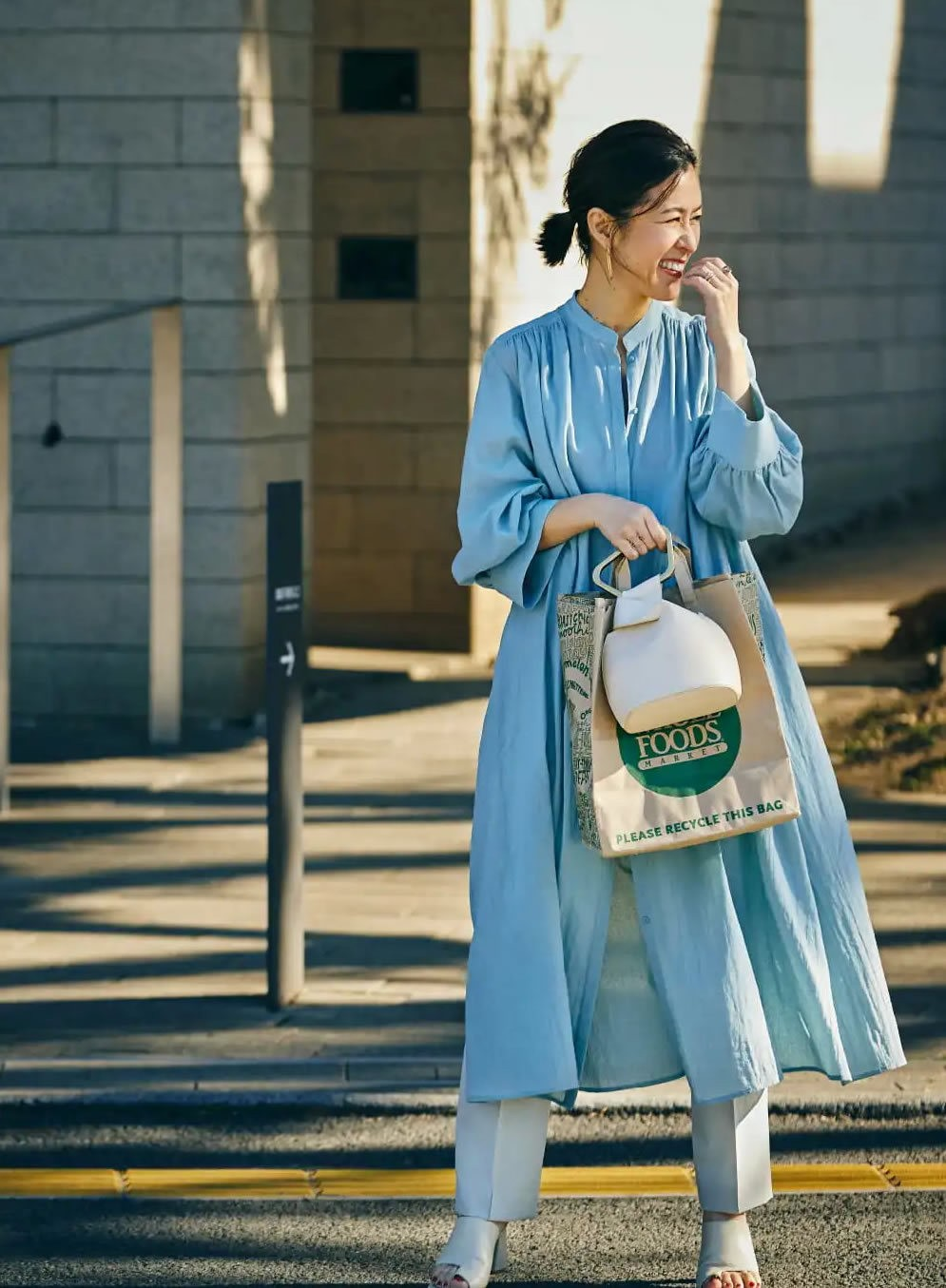 三、长裤搭配如今越来越多中年女性活得大方又自信,这种简约利落的衬衫连衣裙配上直筒西装裤的造型能够更好的展现出她们身上的飒爽气质。