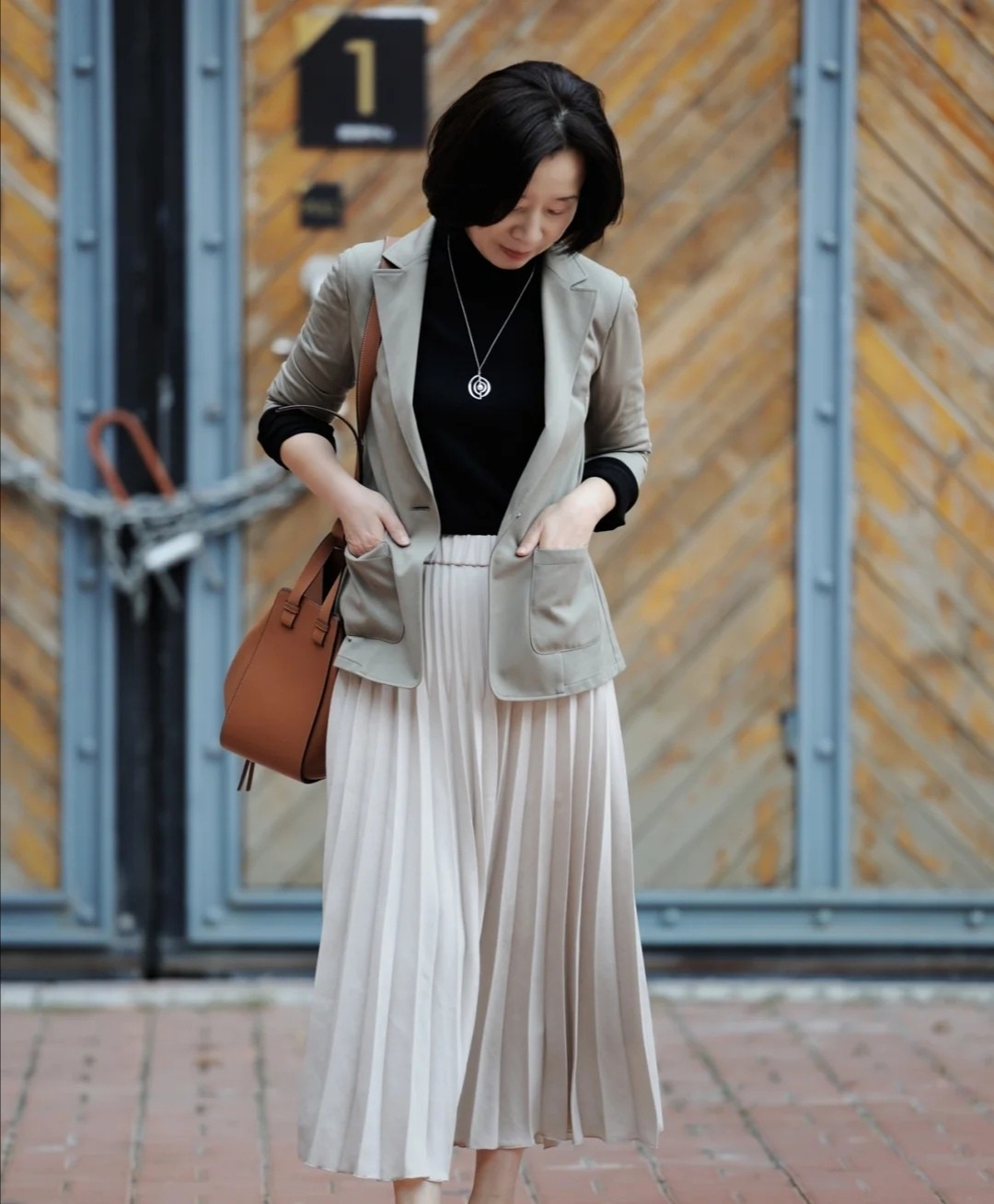 将短小的灰色西服外套配上白色高腰百褶半身裙,正式干练又有温柔气质,百褶裙摆具有规律感的纹理,很好的修饰了西服外套和黑色高领毛衣带来的沉闷与老气感,搭配上长款项链以及单肩挎包之后更有时髦气息。