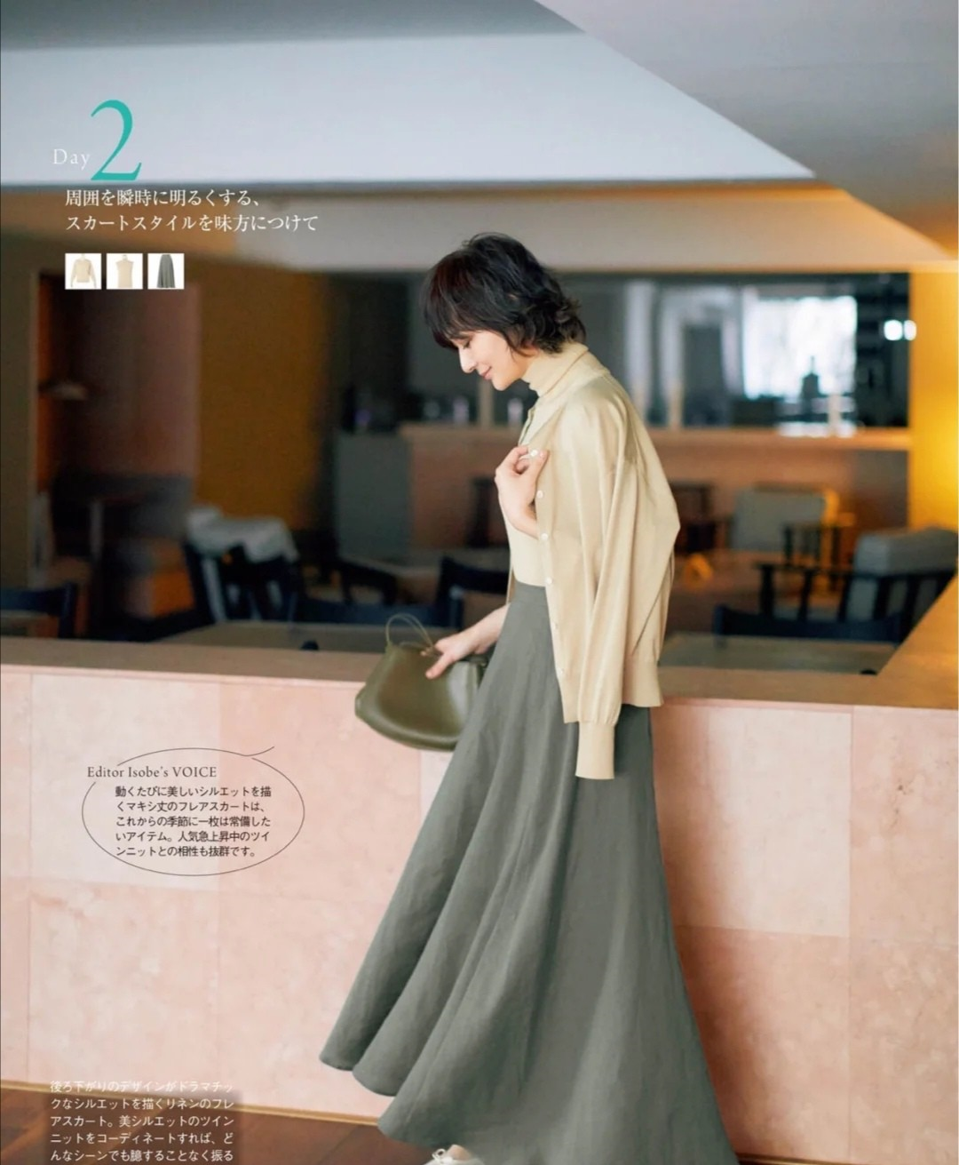 二、半裙搭配A字板型的深色半裙上身之后不仅可以再好的遮挡腹部的赘肉,就连腿型问题也能全部遮盖好,同时宽大的裙摆又能给人一种唯美浪漫的感觉,上半身搭配上短款针织开衫,温柔又显淑女,体现出了一种成熟女性的稳重感。