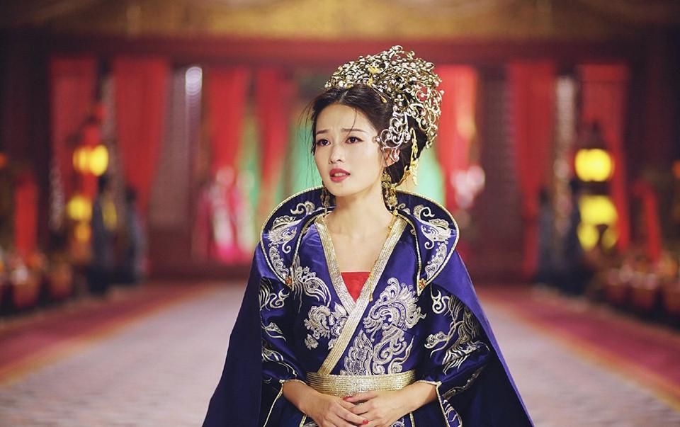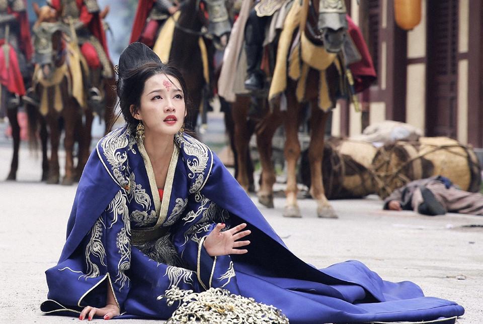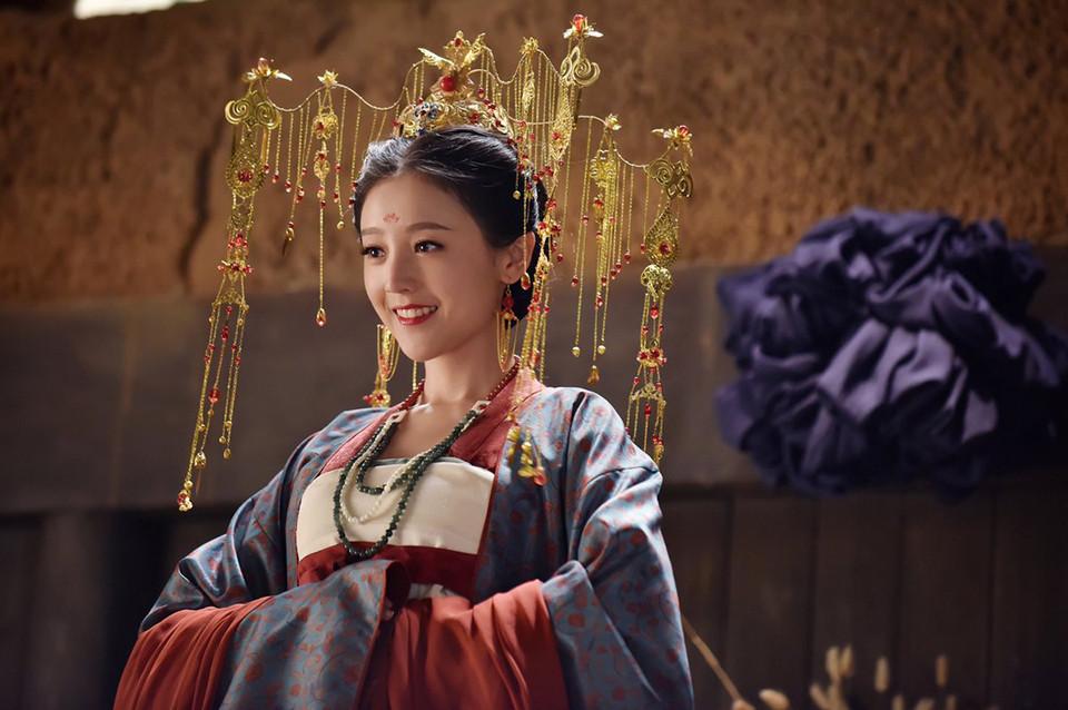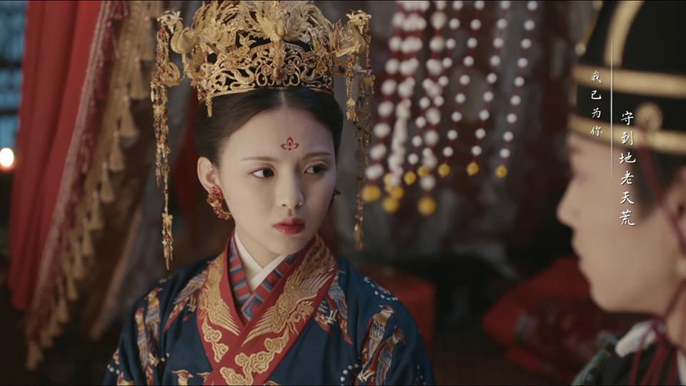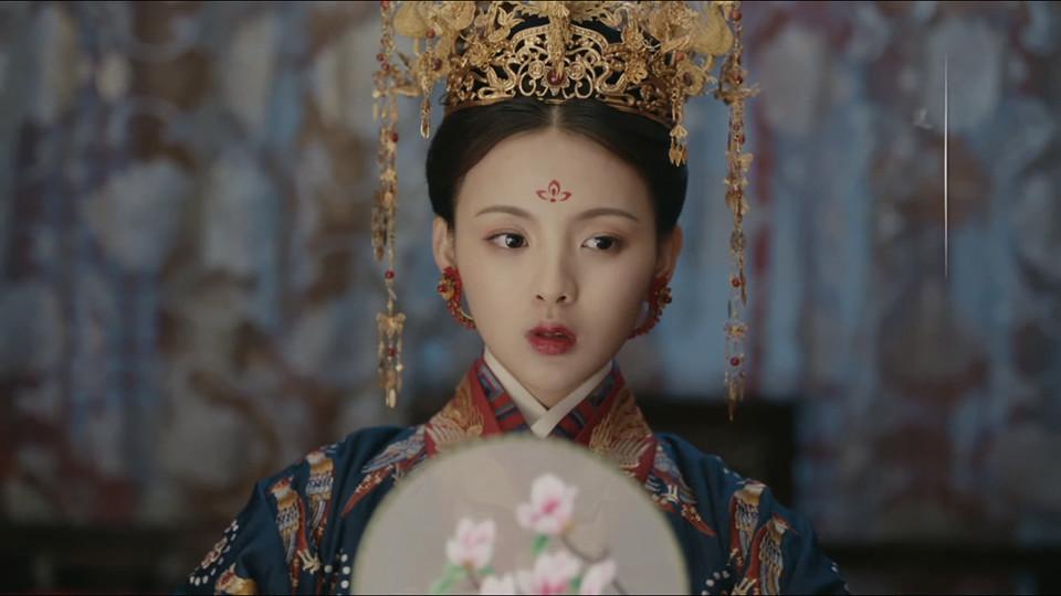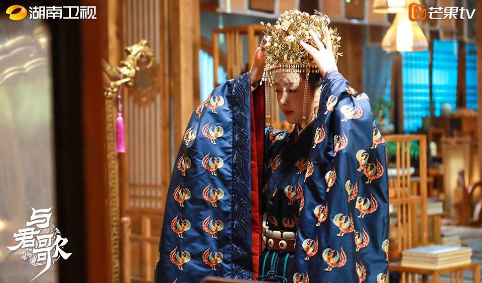 古装剧女星「蓝色系嫁衣」8:宣璐《与君歌》宣璐在《与君歌》这款大婚所戴的金色头冠也华丽,还满美的,这部剧虽然是架空历史的故事,但服装造型参考了唐朝的服制,所以剧中还出现了唐朝特有的花钿,大婚嫁衣同样是翟鸟图样的「翟衣」。