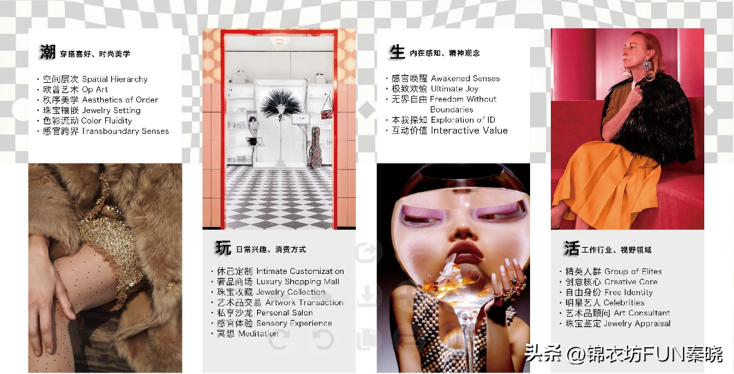 感官饥饿主题下消费者定义为“感官放大者”,从“潮”、“玩”、“生”、“活”四个维度来挖掘质感精英的生活方式与精神世界。追求感官唤醒的欢愉,崇尚自由无界的本我价值,喜欢感官跨界的设计概念,并热衷艺术品交易,注重精神领域的交流与升华,日常消费模式多体现在奢品商场或体己的定制方式,不从众的心态,正是感官饥饿主题下消费者的内心独白。他们有很高的社会地位与消费能力,并不乏一些公众人物,他们需要自由身份的定义,以及对自我形象的独特性放大,兼顾艺术与价值体现,感官体验式消费方能真正打动此类人群。
