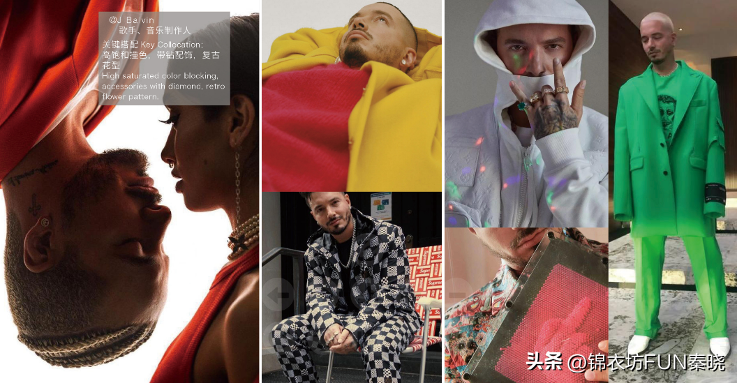 雷鬼J Balvin,在时尚界也拥有很强的个人风格,其专辑《Colors》联名村上隆,合作的服饰和珠宝系列,多彩新潮,被称为“彩虹男孩”。J Balvin身着Raf Simons的高饱和色外套,搭配撞色Dior裤装,登上《W》美国女性时尚杂志2021年05月号,其配饰也多以闪钻为主。他的穿衣宝典被誉为有钱的爆炸彩虹系,沉迷色彩的他,也将这种Colorful的精神融入到生活与作品中。结合到感官饥饿主题,多彩与闪耀光芒的搭配将为男士服装穿搭提供指引。
