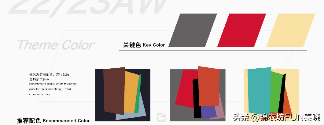 感官饥饿主题下的配色果总体醒目、荧光,在基础的黑色与中性灰调的基础上,添加高饱和的、荧光果的亮色,加强对比与冲突,强烈视觉张力是该主题的配色宗旨;延续春夏的冰激凌黄调,运用温暖触感的材质,结合皮具质地的高饱和色,为秋冬季增添醒目搭配;三个关键色,为本主题重点提取的颜色,将贯穿该系列的秋冬设计研发,可进行多场景应用。