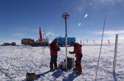 △中国南极考察队员正在钻取冰芯