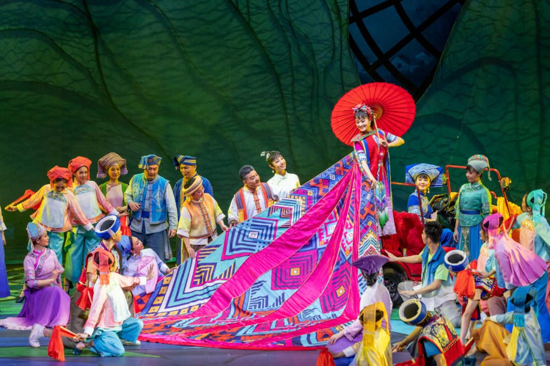 在剧中,新刘三姐“姐美”带领姐妹们研习霞帔织锦工艺,并织出了精美的婚帔,使月亮坡、太阳岭走上了红红火火的幸福之路。