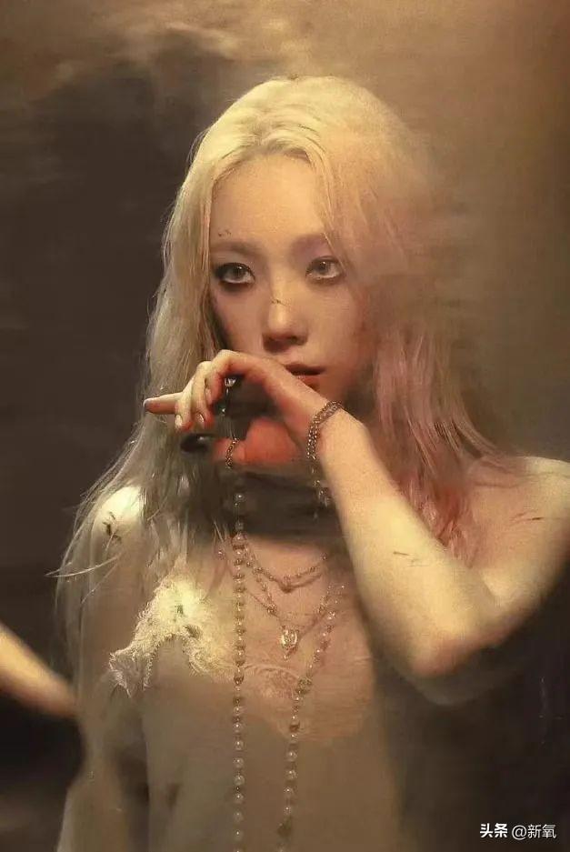 金泰妍在歌曲《can't control myself》中身着米白色蕾丝短裙,佩戴着看起来易碎而又珍贵的珍珠首饰,整体营造出残破而又颓废的感觉,仿佛在末日之中也能感受到这份独特的美。