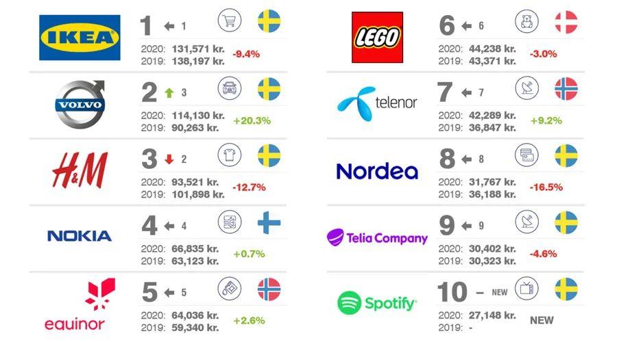 英国品牌评估机构“品牌金融”(Brand Finance)发布 “2020北欧地区有价值的50大品牌”排行榜(Brand Finance Nordic 50 2020)。瑞典的宜家、沃尔沃、H&M包揽前三名。