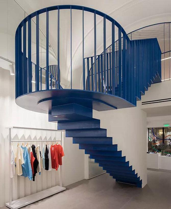 基于对几何与材料的研究,设计师以混凝土作为主要材料,并为之赋予质感丰富的定制表面,同时利用带有不规则图案的彩色大理石重新阐释了帕拉第奥式的经典风格。光泽的表面和雕塑般的塑料及大理石制品更为空间增添了额外的美感。该精品店被设想为由一系列各具特色的空间组成的序列,并通过材料和色彩的不同组合方式来实现区分。