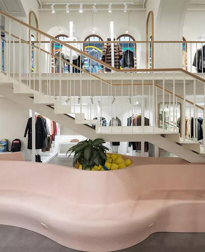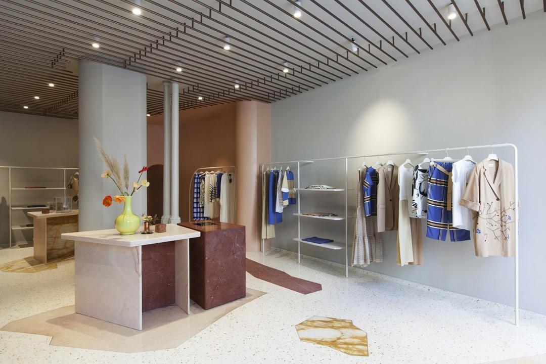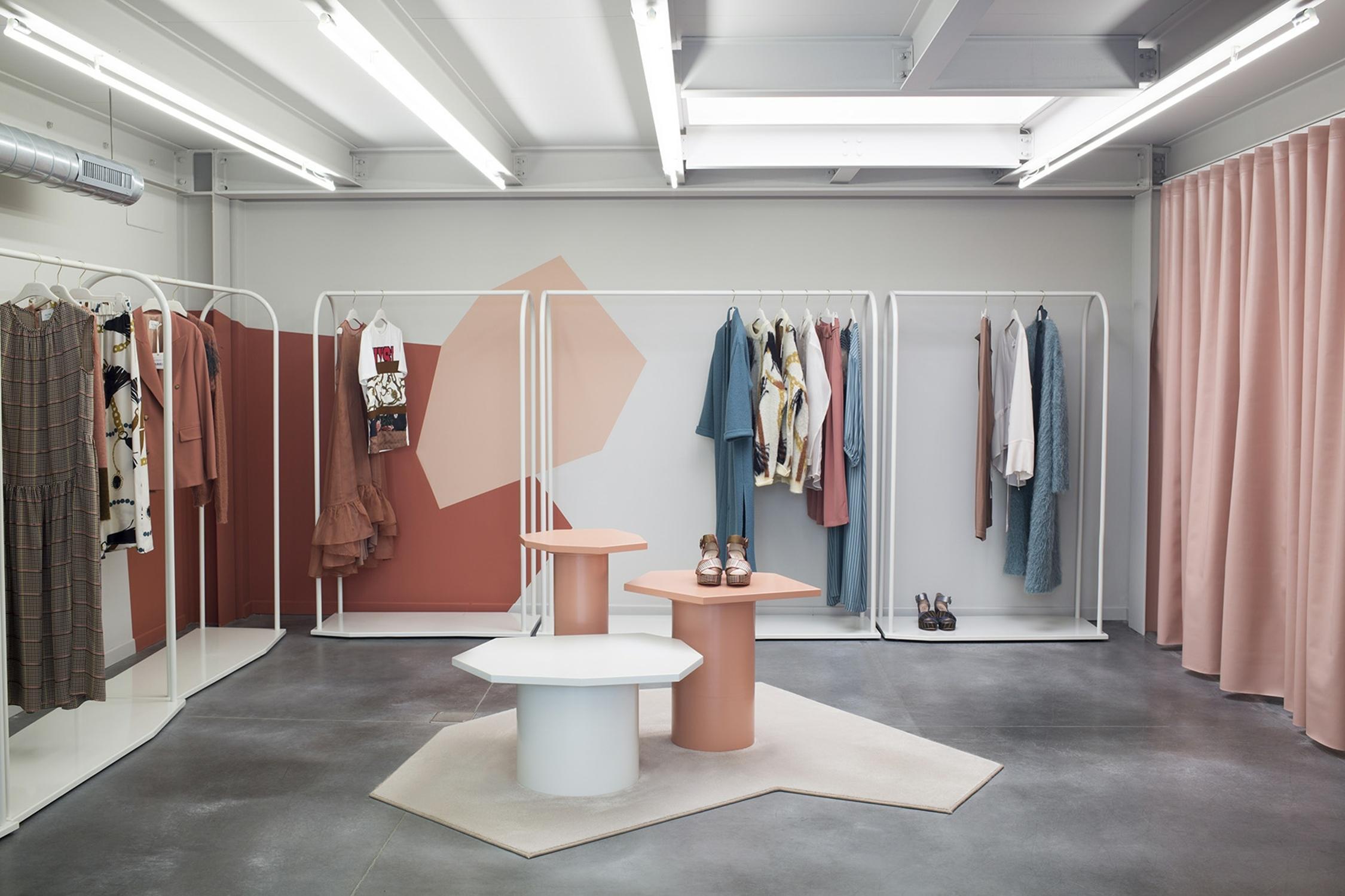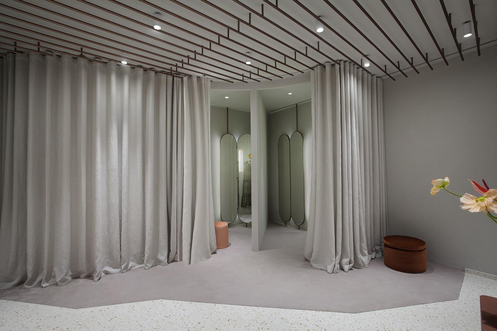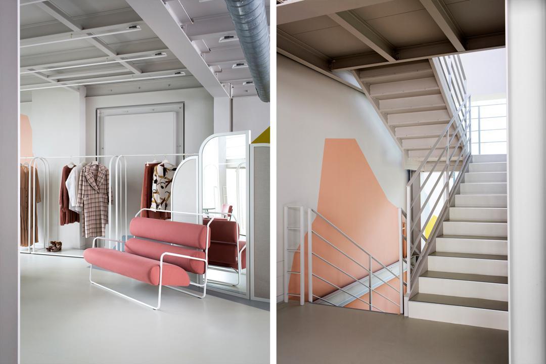 三个主要的空间呈现出层层递进的关系。入口处是清新明亮的套装展示区域,吸引着顾客对成衣系列进行更深一步的探索。接着是色彩鲜艳的过渡区域,连接了第一和第三个空间。该空间的中央设有一面以铜和石膏打造的装置墙,在完善品牌形象的同时还承担了展示配饰的功能。后,试衣间区域宛如一间舒适的小型客厅,地毯和各类家具共同营造出亲切温暖的氛围。