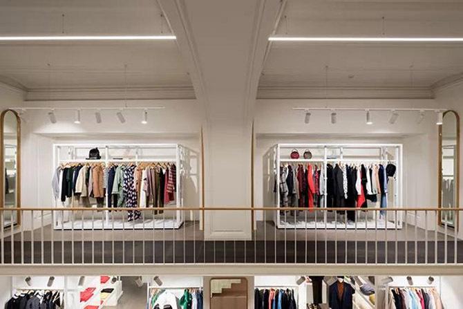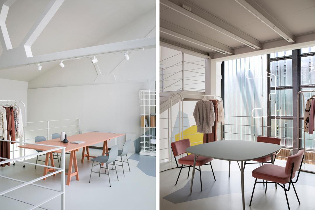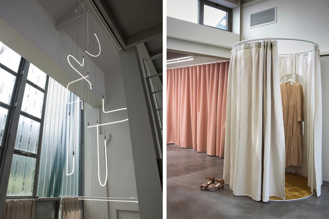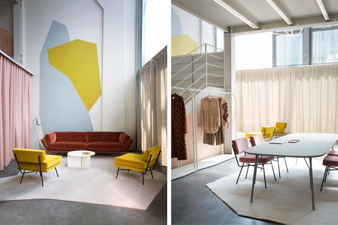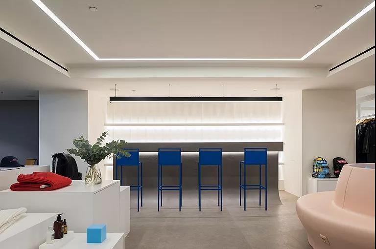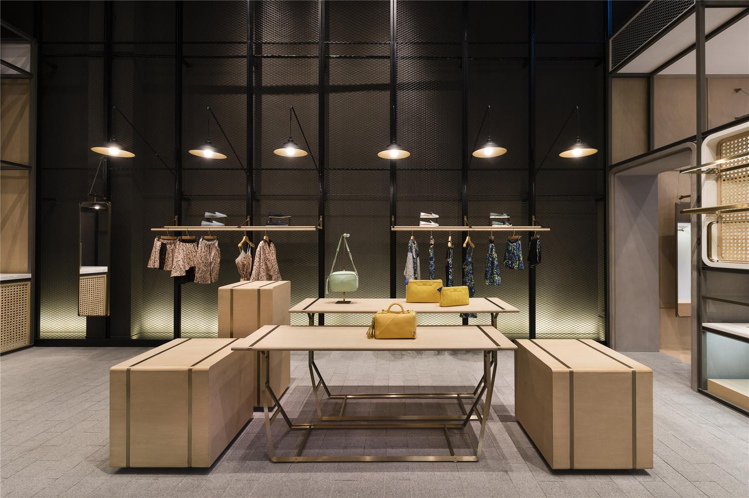 三个主要的空间呈现出层层递进的关系。入口处是清新明亮的套装展示区域,吸引着顾客对成衣系列进行更深一步的探索。接着是色彩鲜艳的过渡区域,连接了第一和第三个空间。该空间的中央设有一面以铜和石膏打造的装置墙,在完善品牌形象的同时还承担了展示配饰的功能。后,试衣间区域宛如一间舒适的小型客厅,地毯和各类家具共同营造出亲切温暖的氛围。