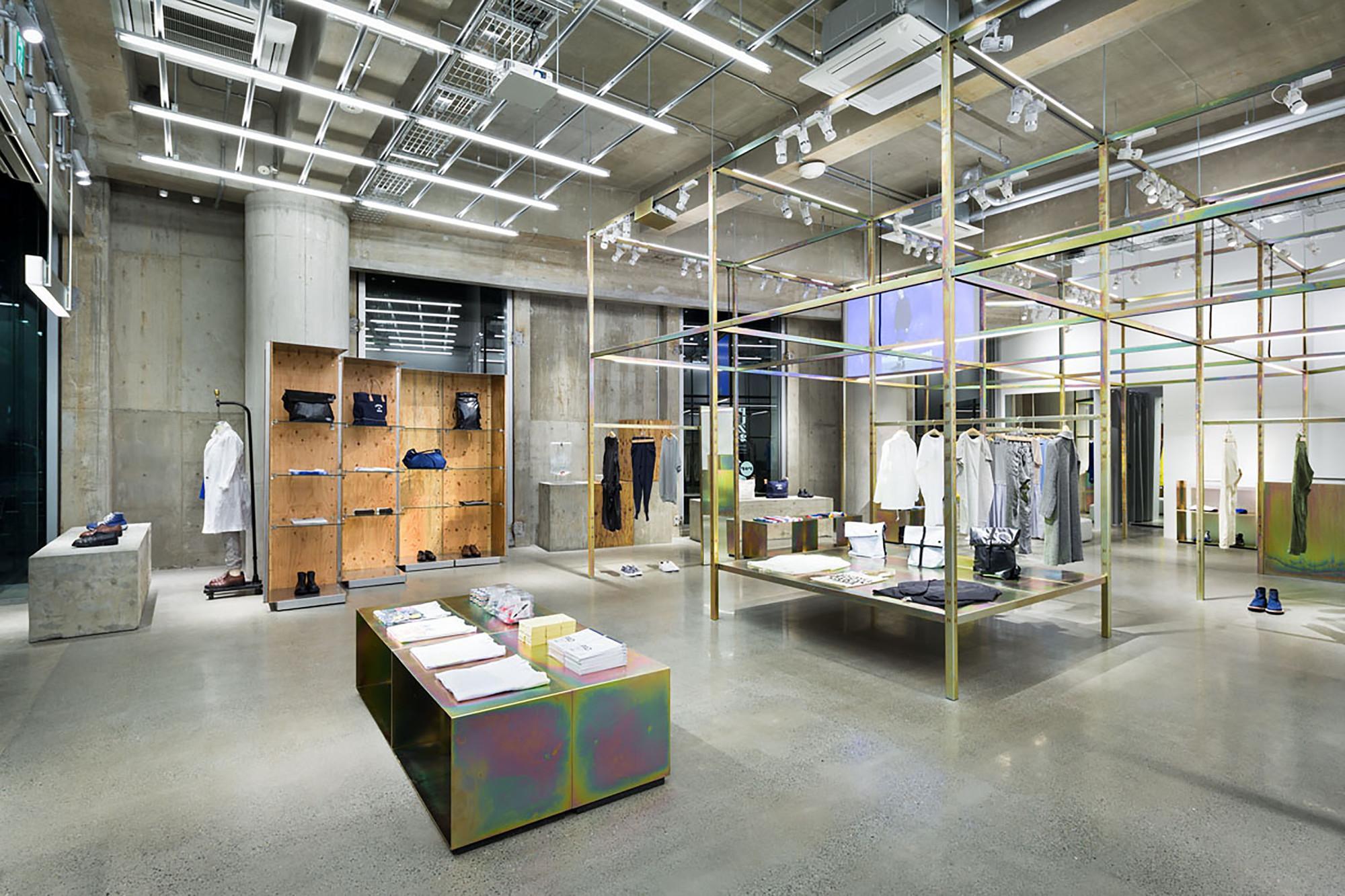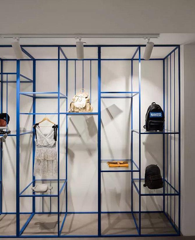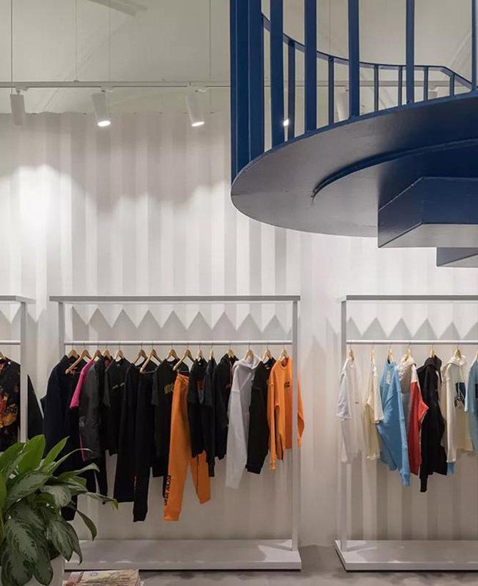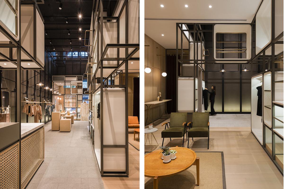这个设计中阐释了一条‘弄’与三座‘弄屋’的关系,并通过这个概念来划分店铺的不同区域:展示空间、等候区、试衣间、以及款台服务区,三座‘弄屋’的结构被模块化,变成可以随意拆卸重组的金属框及活动单元组;上海市井标志性的外伸晾衣架化身成服装展示架;旧式凉椅的竹编被用作单元的分隔;可移动的定制家具在‘弄’内提供灵活的商品展示。