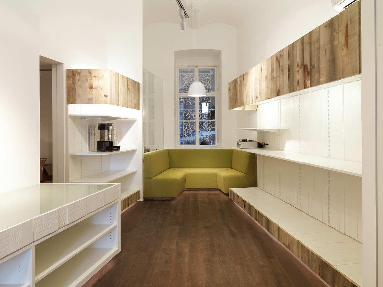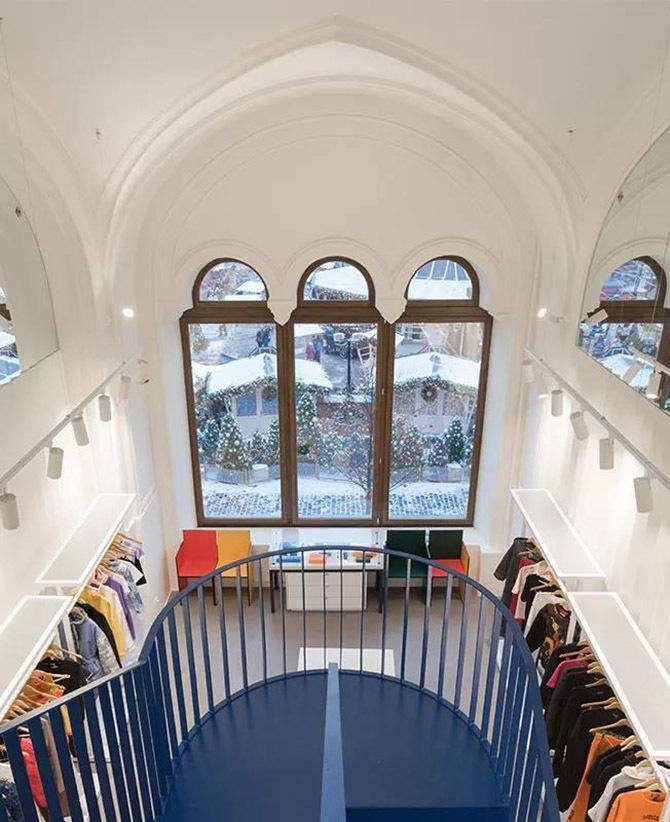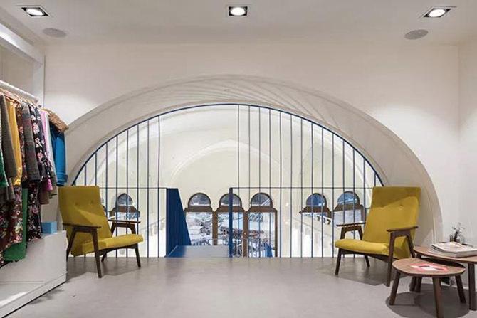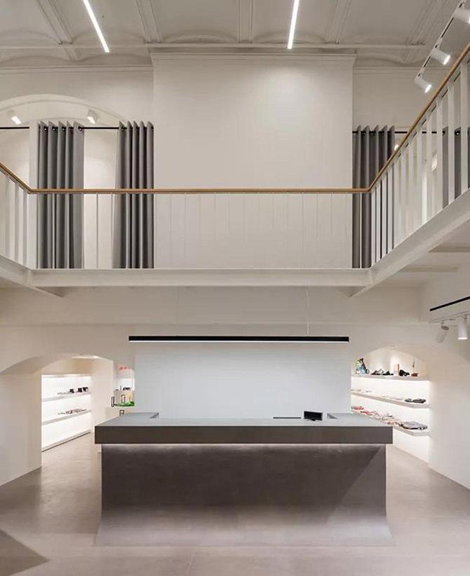 表面粗糙的实木部分保持原状,部分漆成白色,纯粹的装饰材料传递出品牌对待时尚自然、独特的态度和文化背景。清晰、明确的立面和空间概念展现的同时,单位排列的拱形复古天花造型与现代气息的白色室内环境也形成有意识的对比,让70㎡的空间展现出历练之美。