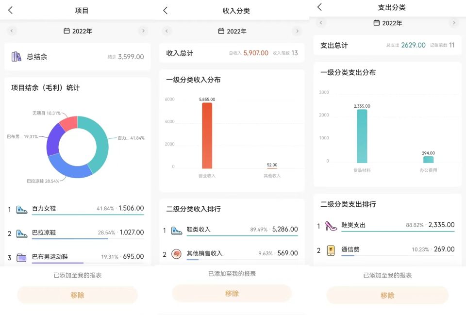 现在用了随手记记账,只需要【自定义首页】 选项里面,增加一项【报表】功能,比如,在项目结余(毛利)统计这个环形图中,就可以看到哪个款式的毛利比较高,占比多。