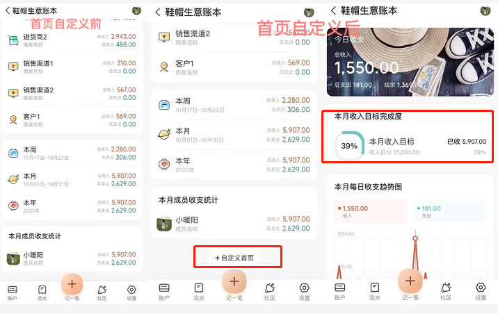 所以在“自定义首页”这里,她每个月会给自己设定一个“本月收入目标”,在首页就能直观地看到当月收入的目标完成度。