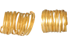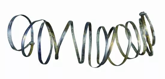 臂环形态颇多。有时是几个手镯一起佩戴,有时则是一体的。一体的臂环多以金属捶扁、拉抻制成螺旋形,三圈至八圈不等。上下两端打制成有开口的环套,可自如调节松紧,避免滑脱。
