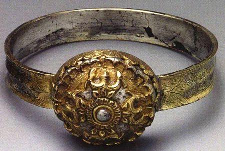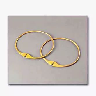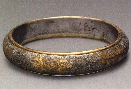 刘家河商墓中出土的臂钏是迄今为止早的实物遗存之一。以直径0.4厘米的金条相对弯成环形,两端锤扁呈扇形,光素无纹,风格简洁明快,可能是周边少数民族所造。
