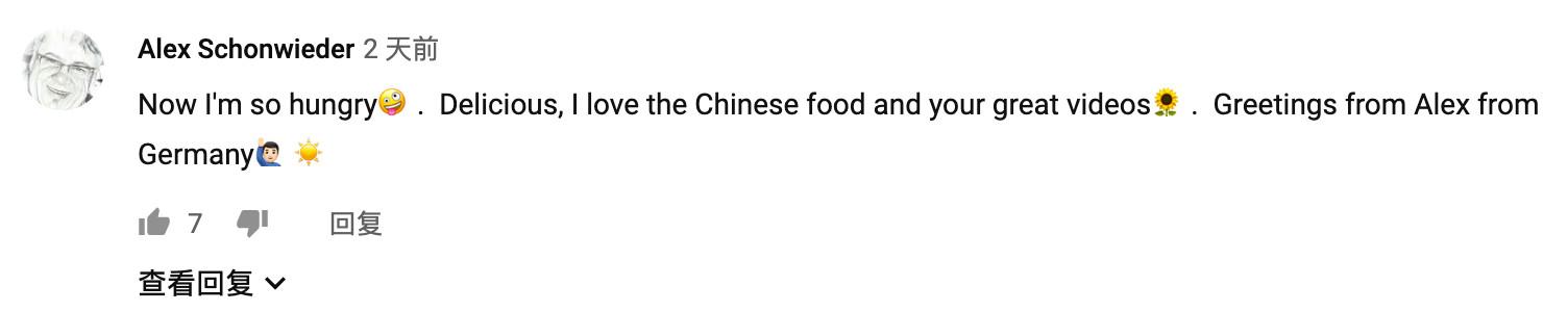 我饿了!美味啊!我爱中国的食物和你的视频。来自德国的问候!