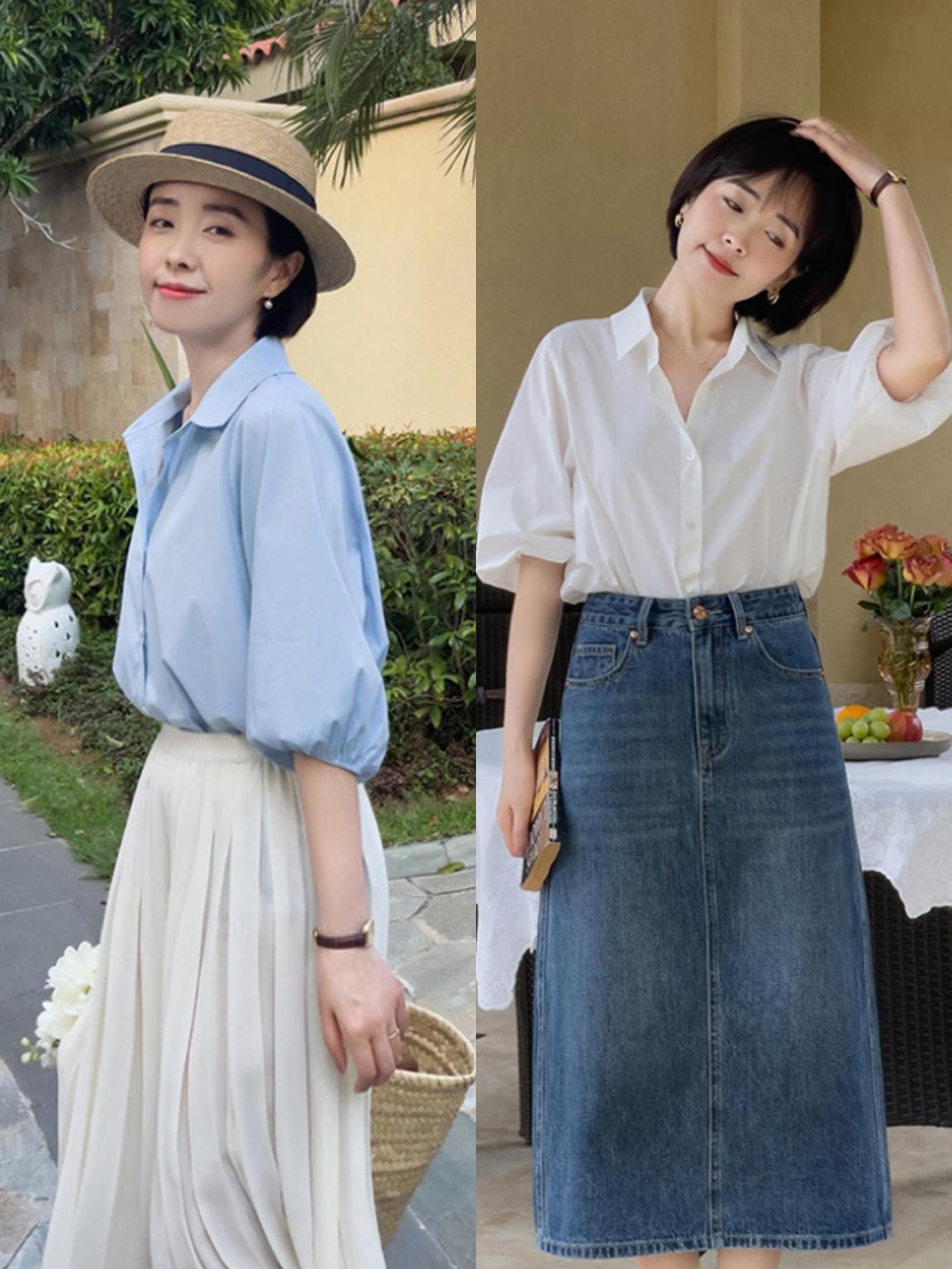 这一组穿搭采用的是同色衬衫和半身裙的配合,半身裙可以帮助女性的臀部线条清晰地描摹出来,因此对女人味的诠释也比较突出。不管是裙装不合身还是认为自己的身材不好看,都可以加入的腰带,把裙装上提并且进行固定,就能显得下肢线条更长。