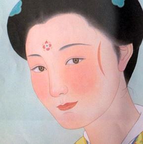 唐代斜红妆不止有月牙状,还有卷曲状、伤痕状、直线状、花纹式状,图中为、花纹式状的斜红。
