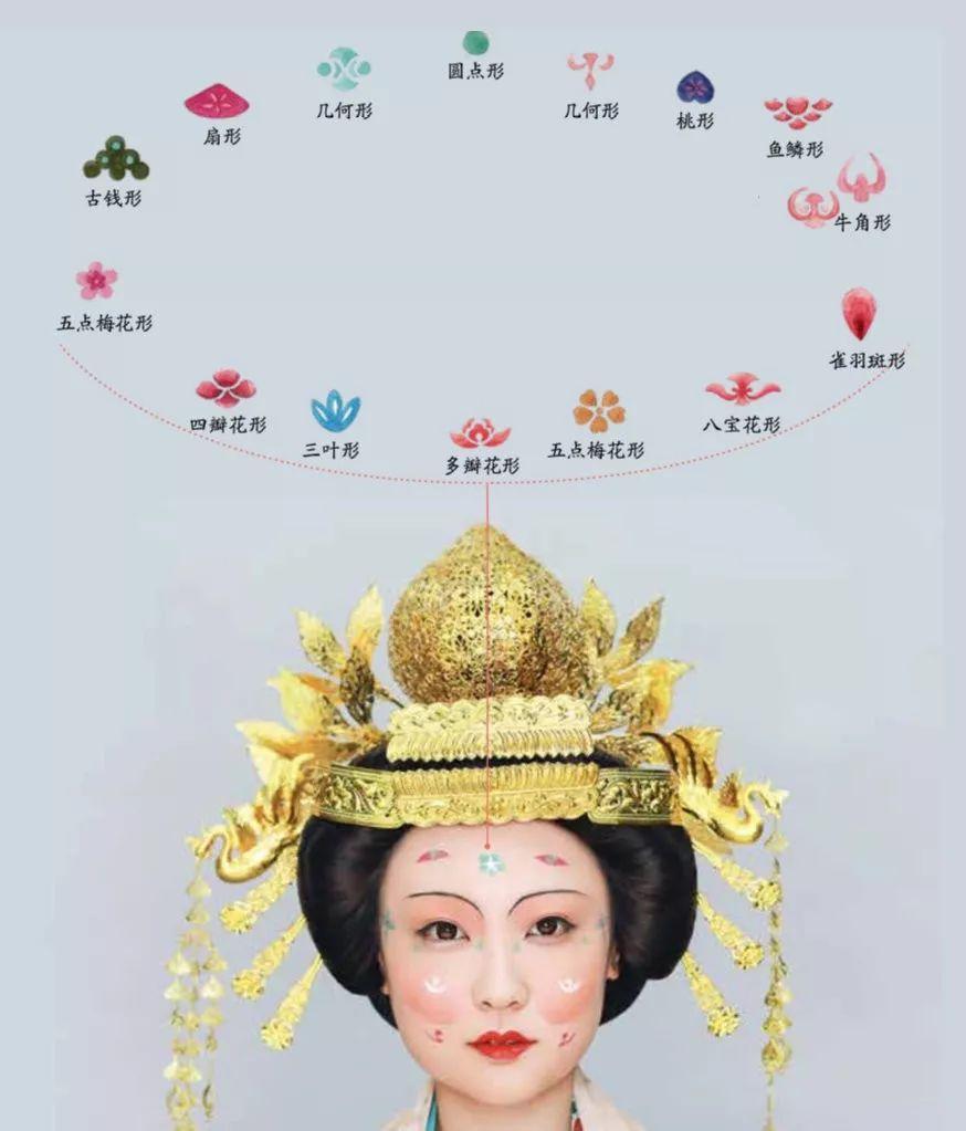 唐朝的花钿造型有各种繁复多变的图案,梅花形、扇面形,甚至有一种“翠钿”,用各种翠鸟的羽毛制成,还有的是用蜻蜓的翅膀做成。古代的女子为了爱美也是无所不用其极了。