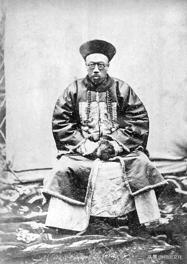 清同治十三年(1874),湖北汉口,身着冬季朝服的道台大人,端坐于临时搭建在草地上的布景布前。