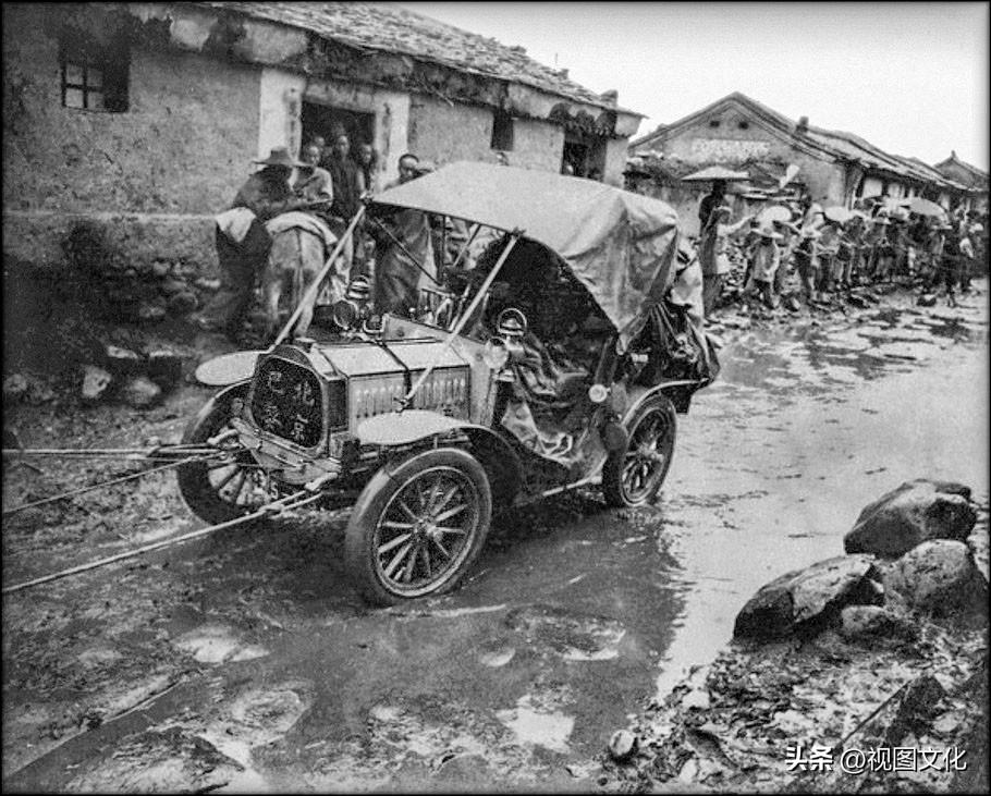 光绪三十三年(1907),泥泞的街道上正在进行一场汽车拉力赛,从车头文字上看是巴黎——北京。