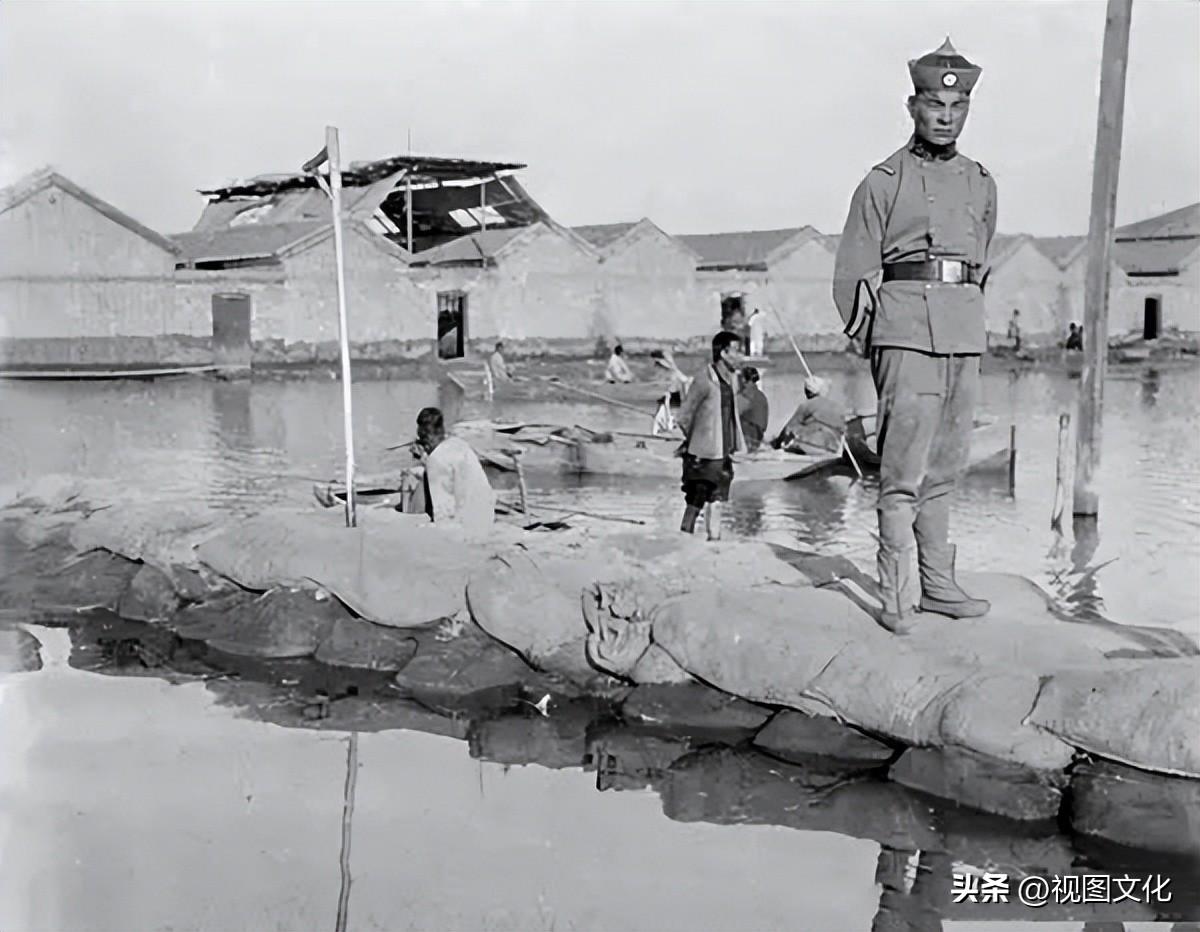 清末天津,一场洪涝灾害之后,一名警察装扮的人站在沙包上值勤。