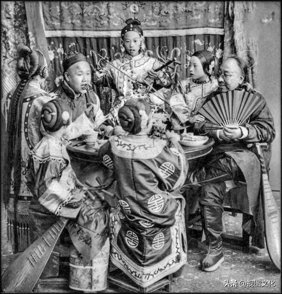 光绪二十七年(1901),北京,富商用餐时的情影,招数位歌妓演奏助兴。