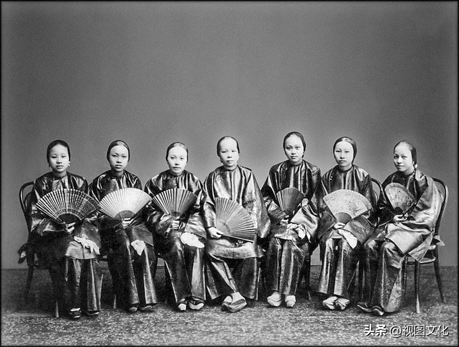 清光绪六年(1880),中国广州,一家大户人家的女眷,均衣着绸缎,手拿折扇。