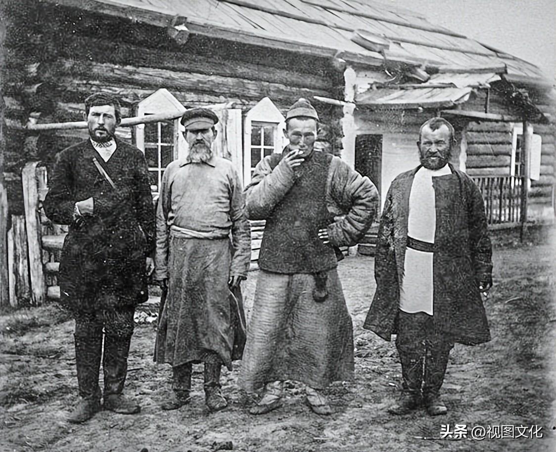 清末东北,汉人(左三)与三个俄国人在木屋前合影。
