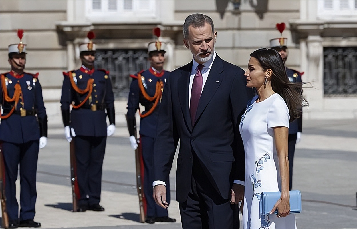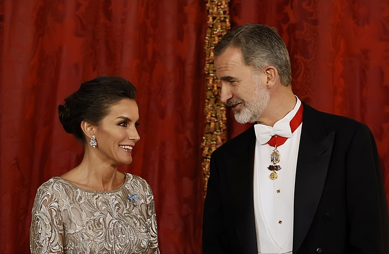 西班牙国王夫妇在国宴上还不忘秀恩爱,两人相视一笑,也太甜了吧!而莱后在白天的造型中,走的是清新感的风格。