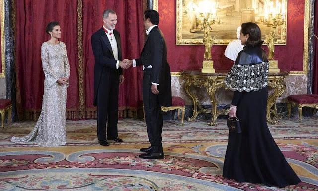 49岁的莱后这几年老了很多,脸颊有些凹陷,但是仪态和气质方面确实是优雅。在周二晚上的国宴上,莱后一席银色的镂空裙闪耀亮相,长袖的设计显得有些拖沓,其实莱后还是比较适合紧身一些的晚礼服裙子,莱后过于纤细的身材,似乎都有些撑不起来这条裙子,不像平时那么有挺拔感。