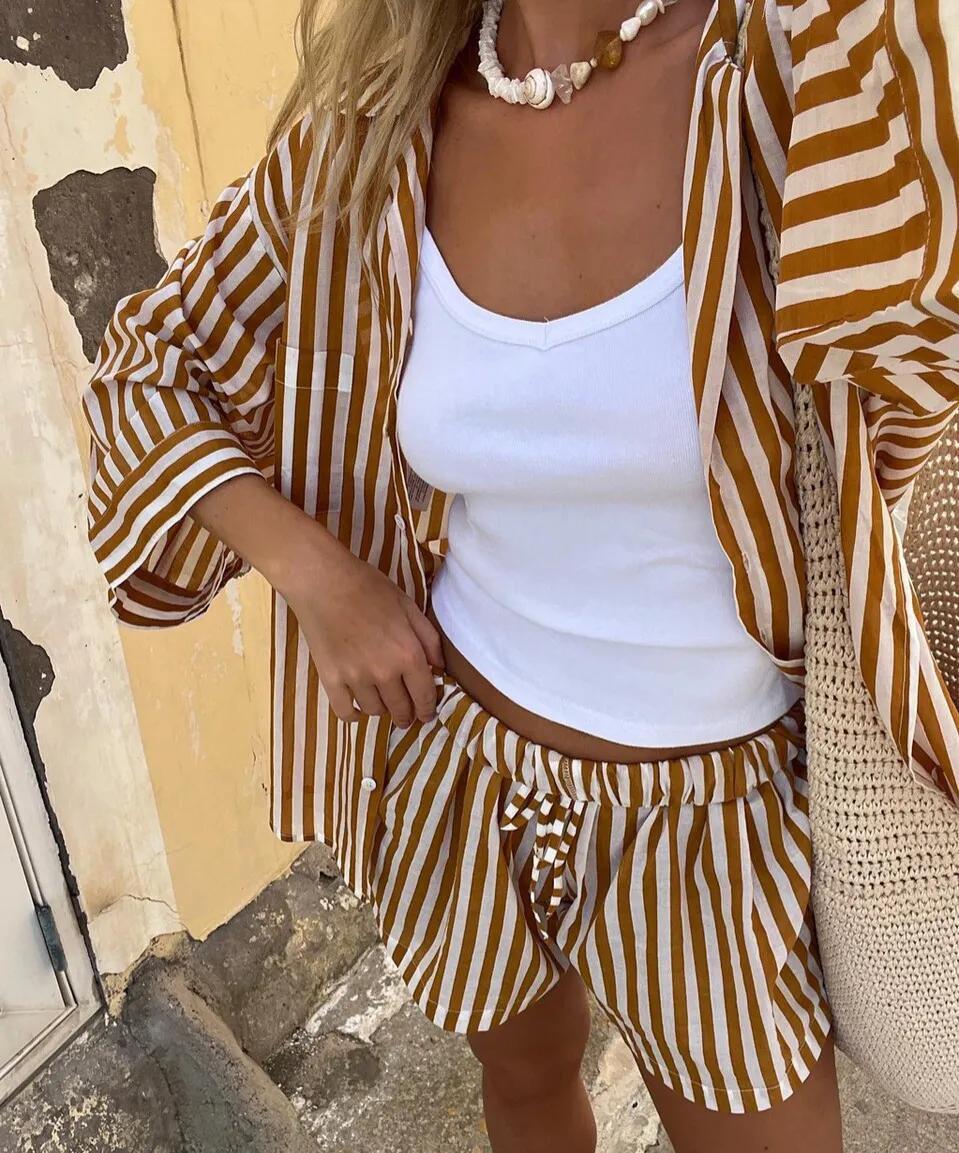 在炙烤的高温下,这样一身轻薄的套装不妨是一种清凉的穿搭。上装的宽松衬衫不仅时髦大气又有很好的防晒果,像博主这样搭配一件白T恤,更是时髦与休闲两不误。