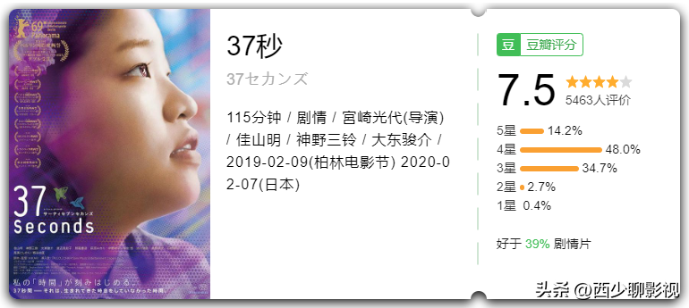《37秒》是由宮崎光代执导,佳山明、神野三铃、大东骏介等主演的日本剧情片,2019年上映。讲述了一个因脑瘫残疾的姑娘寻找自我的成长故事。