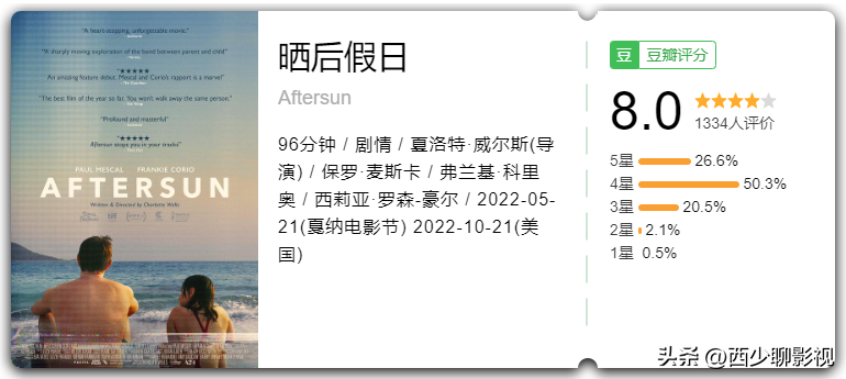 《晒后假日》是由夏洛特·威尔斯执导,保罗·麦斯卡、弗兰基·科里奥、西莉亚·罗森-豪尔等主演的剧情片,2022年上映。讲述了苏菲回忆起20年前和父亲一起度过的时光。