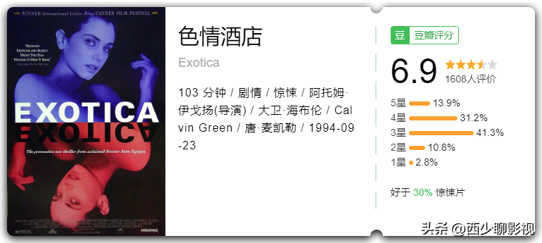本片又名《性感俱乐部》,是由阿托姆·伊戈扬执导, 米娅·科施娜、布鲁斯·格林伍德、唐·麦凯勒等主演的悬疑剧情片,1994年上映。讲述了在加拿大北部某城市的性感俱乐部里,形形色色醉心于灯红酒绿并深陷人性孤寂之中的人们的遭遇故事。