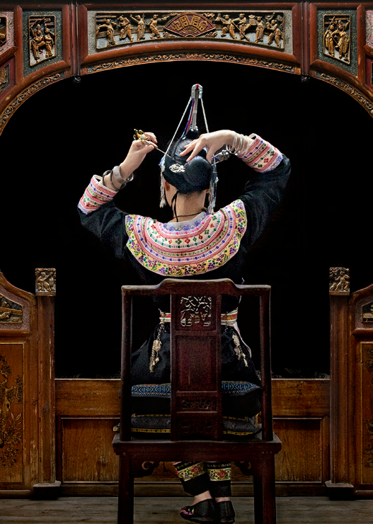 一个完整的“雄冠式”可分为凤箍、抓头、笄、发簪、裹红布、黑色缠头纱六个部分,主要用银打制,辅以木、布、瓷珠等装饰材料。“椎髻高钗”正是凤头造型;缀在凤冠银链上的银片,形如翎羽,银片上刻画有钩爪纹;“垂璎”即盘垂于两侧的瓷珠,叮咚作响,宛如凤鸣。