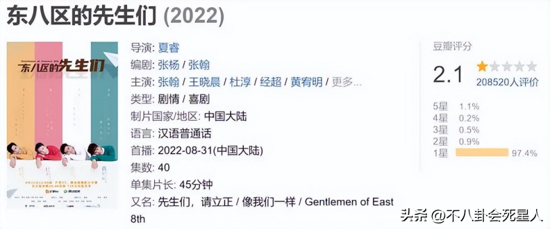 《东八区的先生们》贡献了本年度评分低的一部剧,仅2.1分,不论是谁看了,都没从这部剧中找到一个令人满意的地方。