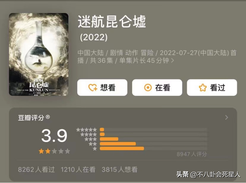 同样是3.9分的作品还有许凯、钟楚曦主演的《迷航昆仑墟》,这部剧是根据天下霸唱的著作改编的,只能说终呈现出来的影视剧情和原著是毫不相干。
