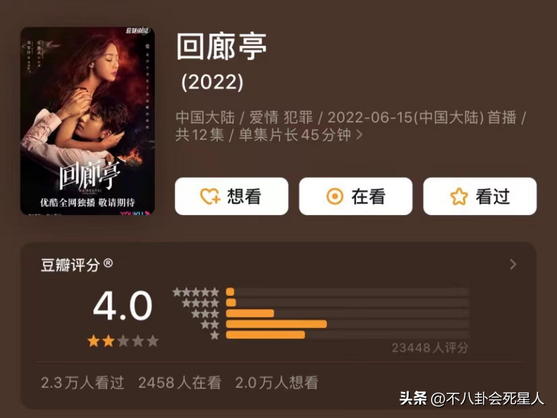 可惜《回廊亭》的导演和编剧没有将两人的演技优势发挥出来,胡乱改编,男主直接有往恋爱脑发展的趋势,4分的评分实在对不起两人的演技。