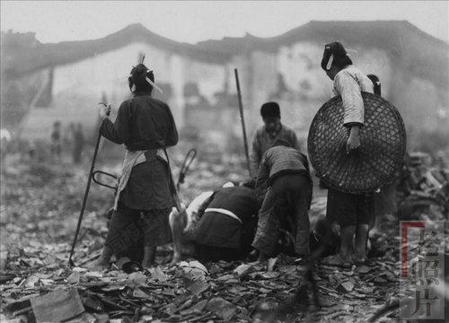 福州的女子实际上经常劳作,男子出去务工,留下来的女子也在拼命劳作。照片上可以看到象征着福州女子一风俗的发饰,昔日是为了防身而佩戴的小刀和像小矛一样的簪子,在腋下夹着的是斗笠,手上拿的是扁担。