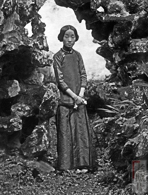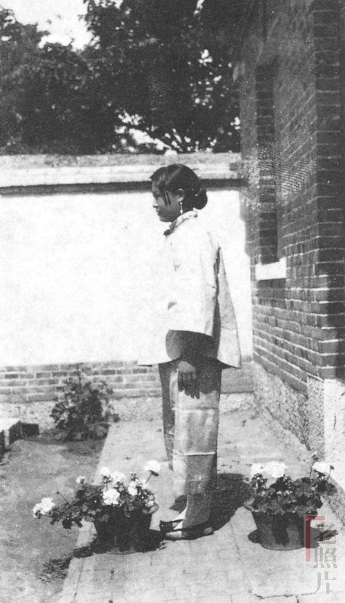顾公硕遗留下的老照片中,有不少拍摄对象为女性。这些女子有的是顾家的女儿、媳妇,或者亲戚,更多的则是社会女性,属于随手拍摄。照片中隐隐散发着青春之美,装扮之丽,气质之魅。可以看出,拍摄者在有意无意之中,以摄影镜头展现了一个家族的女性以及时代的变化。这张照片约摄于20世纪20年代,照片中的女子身穿传统服饰,手腕和脖子却戴着饰品,可见家境殷实,背景是园林中的假山。