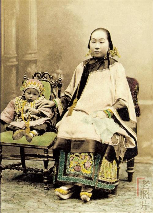 照片1880年摄于香港,由金伯宏供稿。画面上的是一个带孩子的少妇,她和孩子两人端坐在椅子上。少妇梳着整齐精致的发髻,穿着华丽的服饰,身上佩戴着昂贵的首饰,面容平静,看向前方。