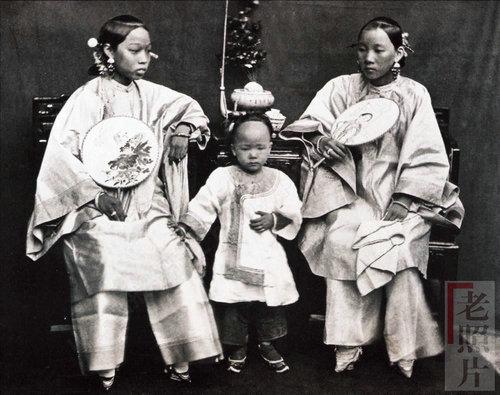 图中是两名穿着华丽贵族服饰的女人坐在椅子上,中间站着一个小孩子。两个拿着团扇的女人留着相同的发型,佩戴着昂贵的头饰和手镯,两人脚下那双三寸金莲也十分引人注目,可以看出家境十分殷实。