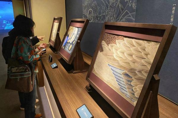 为让观众更好感受《莲塘乳鸭图》的技艺,展览还展出了缂丝书画艺术传承者对《莲塘乳鸭图》原作仿缂的四个重要局部,比如荷花、公鸭羽毛等,每个部分都等比例放大了三倍,一共要缂上半年之久,而以《莲塘乳鸭图》的尺幅和精细程度,至少需要八年才可以完成。