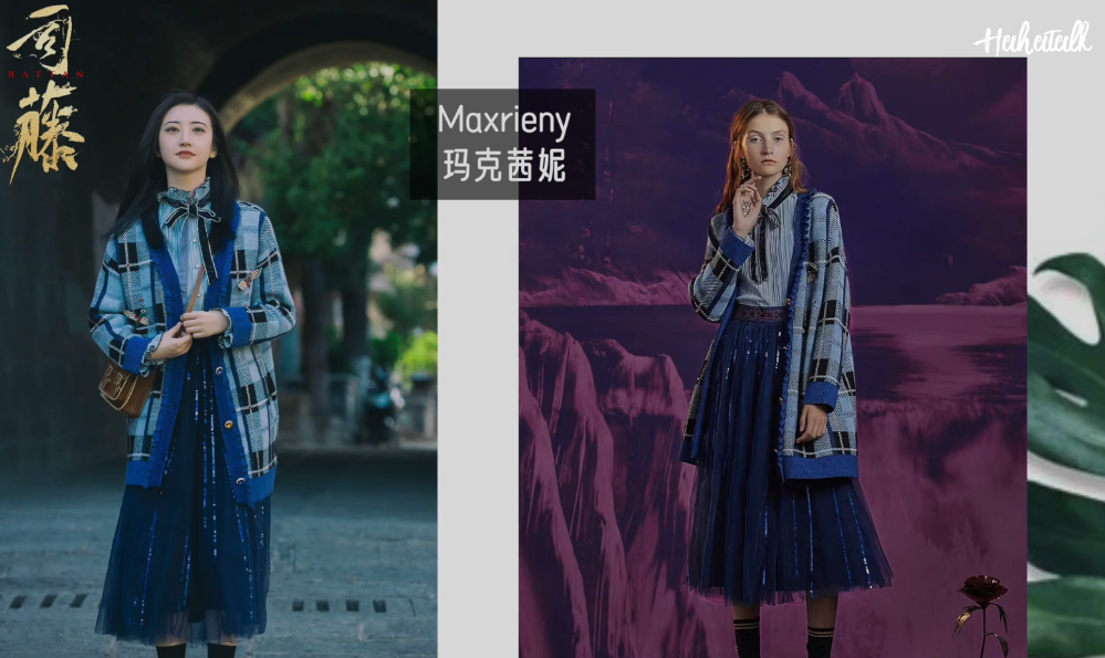 第二个look全套都是来自一个仙气十足的复古品牌玛克茜妮,不知道大家有没有注意过这个牌子在很多商场都是有专柜的,它的设计都有一种很童话风的感觉,司藤里面有几套都是出自这个品牌,从图片中的这套来看,衬衫是一个褶皱质感的雪纺衬衫,它的价格是1089元,裙子是一个网纱的半身裙,上面有亮片的刺绣,它的价格是779,可能跟这部剧大火有关,这件外套已经下架,它的价格是827人民币,喜欢复古童话风的朋友不妨留一下这个牌子。