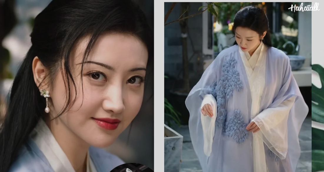 第四个look,是一个手工绣花的桑蚕丝外套,来自原创设计师品牌,它的创始人热爱传统的手工艺,所以在设计中经常可以看到精致的手工刺绣,还有很多古风和汉服的元素,那很多都是有艺术收藏的价值,比如景甜的这一件就是一件素纱禅衣,是一个素雅的水蓝色,在桑蚕丝的面料上面拥用意大利进口的羊毛,手工刺绣了紫藤花,是很走心的一个做工,而这件的价格是1799人民币。
